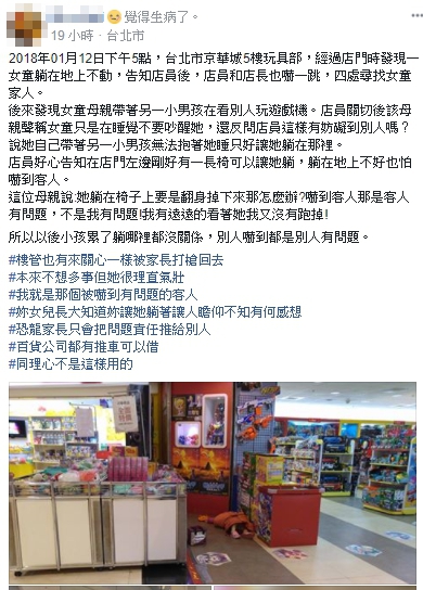 而店員聽聞,也機智回應,正好店門口左邊有一張長椅,可以讓孩子躺著休息,不然怕躺在地上會造成其他客人不便。結果這名媽媽非但沒有領情,還大言不慚回:「她躺在椅子上要是翻身掉下來,那怎麼辦?」並說道「嚇到客人,是客人有問題,不是我有問題!」認為女兒已經在自己視線範圍裡,有盡到看顧的義務,「我又沒有跑掉!」