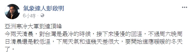 亞洲寒冷大軍到達頂峰!」他指出,這兩天的清晨對台灣是最冷的時候,雖然接下來兩天就會慢慢回溫,但是今晚到明(14日)清晨的溫度還是很低,仍要注意保暖。另外,彭啟明也透露,下週天氣會和這幾天落差很大,「要開始適應暖暖的冬天了!」