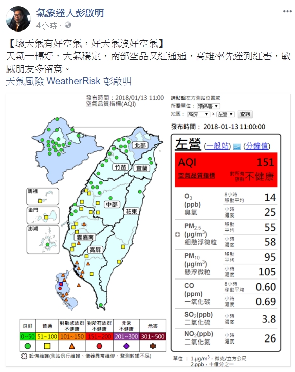 彭啟明還表示,由於今全台天氣好轉回溫,大氣也穩定,南部地區的空氣品質也因此變差,目前高雄市已兩處達到「紅害」等級,請敏感族群多加注意。