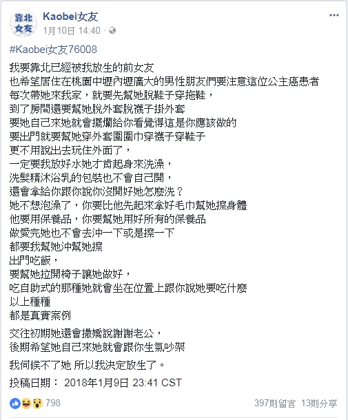 分手,指稱她是「公主癌患者」,要廣大桃園地區的男性朋友特別留意:「我伺候不了她,所以我決定放生了。」