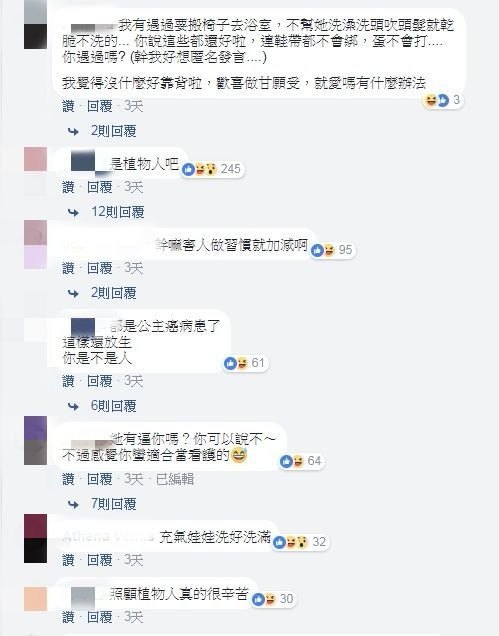 看完上述指控後,網友紛紛留言:「這是植物人吧」、「是在洗充氣娃娃嗎」、「快去考看護工作,肯定考取的」。但也有人留言批評原PO,「公主病根本是被你寵出來的」、「這樣還放生你是不是人」,甚至有人質疑如此誇張的行徑是否真有其人。
