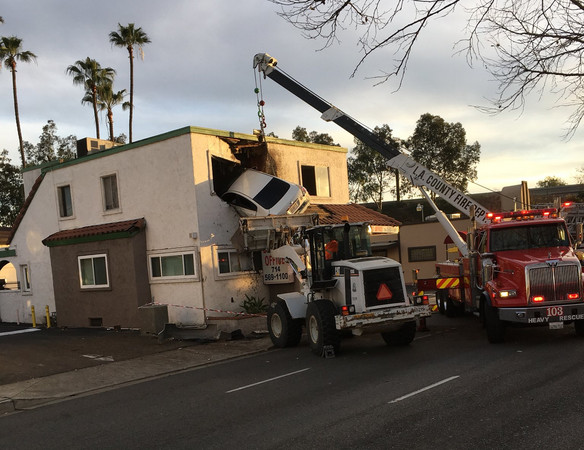 雖然車子裡的人都被救出來,但卡在診所2樓的車子動彈不得,地上還散落著許多石塊,天亮了之後,洛杉磯郡搜救隊前來幫忙,出動了堆高機和多吊車等大型機械才把車子「拔」出來,原先因為車禍而引起的小型火災也很快地就熄滅,除了車內的兩人,沒有其他人受傷。