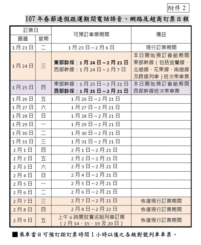 而今年台鐵春節連假車票將從1月24日(星期三)開放東部幹線列車售票,而西部幹線對號列車則將於1月25日(星期四)0時起開放,詳細列車班次今起就可於台鐵局官網查詢。