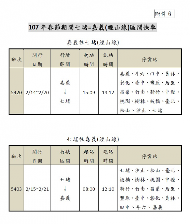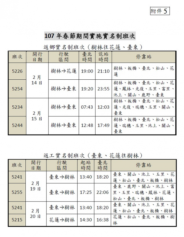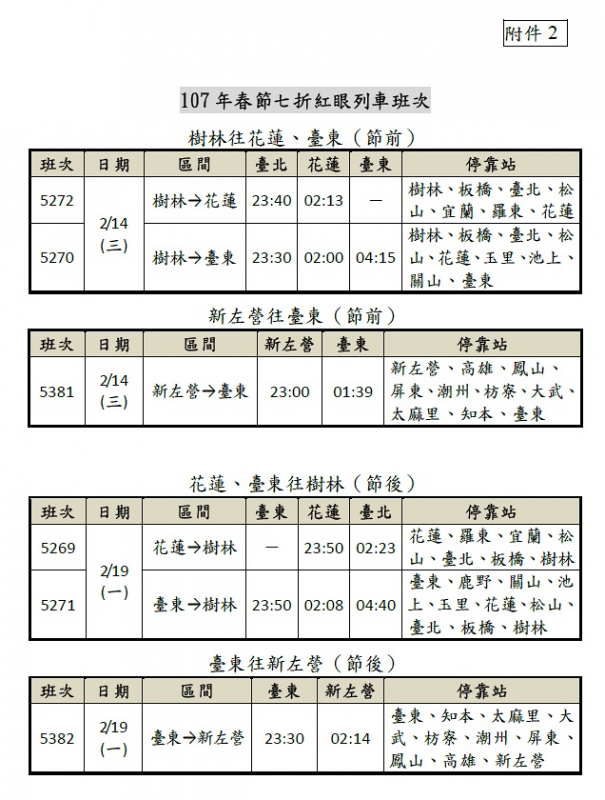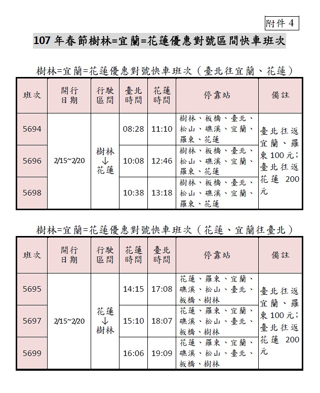 台鐵局也表示,2月15日至2月20日將會加開樹林=宜蘭=花蓮對號區間快車,並提供北宜100元、北花200元優惠票價。2月14日、15日、19日及20日也將加開東線8班實名制及12班返鄉自強號專車。
