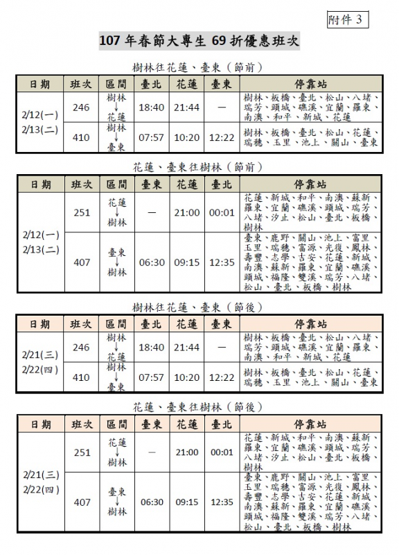 此外,為分流春節尖峰時段旅客,,除於今(107)年春節疏運期間之節前(2月14日)及節後(2月19日)離峰時段推出七折紅眼列車外;另於節前(2月12、13日)及節後(2月21、22日)實施指定班次大專生69折優惠票價,以紓解尖峰時段人潮。