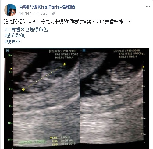 百吻巴黎楊雅晴在臉書專頁PO出「二寶」的超音波照片,秀出寶貝9周大的模樣,從照片中可以清楚看到「二寶」的身形,她感到敬佩的說「這是閃過