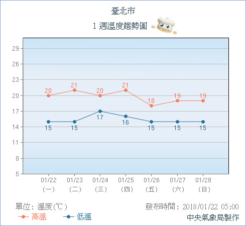 低溫14至16度,其他地區則為多雲。周日(28日)起鋒面及冷空氣南下,氣溫會開始下降,而下周二至周四最冷,台北市氣溫可能會降到12度。