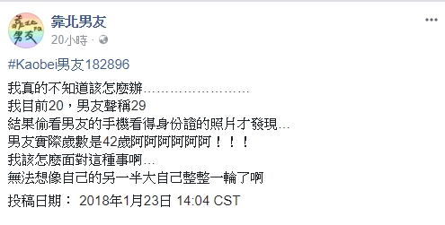 ▼女網友發文詢問發現男友謊報年齡 該怎麼處理(圖/翻攝自臉書 靠北男友)