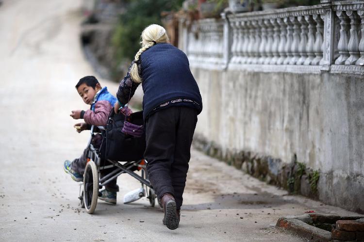 腦性麻痺,無法正常走路,而男童的母親之後改嫁,父親也為了養家外出到桂林工作賺錢,於是照顧男童的責任就落在76歲奶奶身上,奶奶每天不辭辛勞地用一輛破舊的輪椅推著男童往返學校,一天8趟來回共24公里,這一推就持續4年,這樣的親情關愛就連