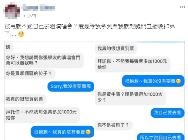 張學友演唱會門票,「我真的很想買到票」、「拜託你,不然我每張票多加1000元給你」,而原PO也很有禮貌的回應,「很抱歉~我真的沒有要賣。」