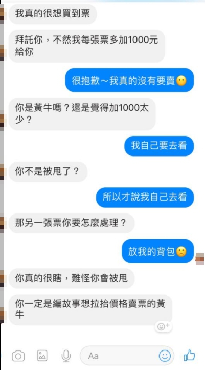 黃牛嗎?還是覺得加1000太少?」,原PO則耐心表示「我自己要去看」,對方質疑他已經被甩,「那另一張票你要怎麼處理?」,面對無理的逼問,原PO的理智線也快掉斷掉,不想再糾纏不清,便敷衍回應「放我的背包」,不料對方竟直接爆氣,怒嗆「你真的很瞎,難怪你被甩」、「你一定是編故事想拉價格賣的黃牛」,讓原PO超傻眼。
