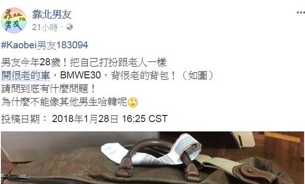 女網友PO文除了抱怨男友28歲就打扮的像老人一樣,還嫌氣說:「開很老的車,BMW E30,背很老的背包!請問到底有什麼問題!為什麼不能像其他男生哈韓呢?」結果就引出了眾多網友瘋狂砲轟她「不識貨!」,還有一群熱愛車子的玩家紛紛秀出自家的經典款老車。