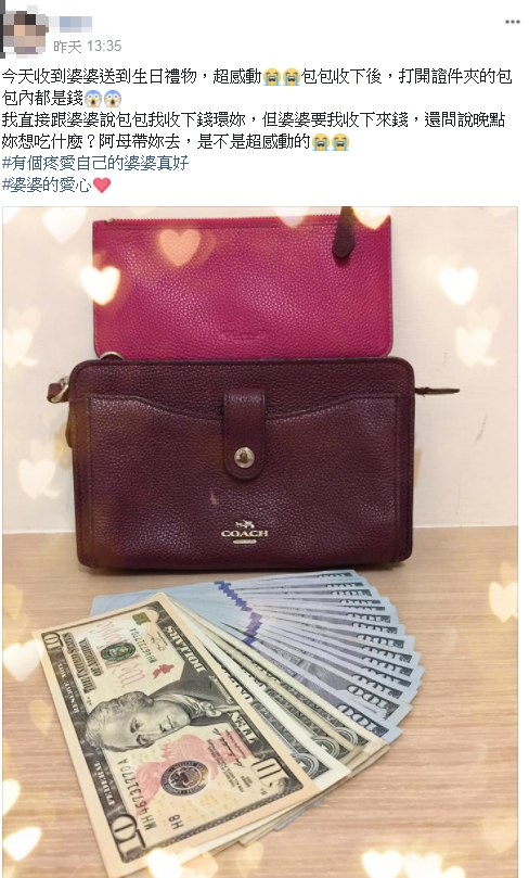 爆廢公社」表示,收到婆婆送給她的生日禮物,只見照片中,有2個要價不斐的名牌包,沒想到原PO一打開皮夾,裡面竟還放了滿滿的美金,乍看之下約有1615美元,換算成台幣大約4.8萬元,若加上名牌包總價值肯定超過5萬元,「我直接跟婆婆說,包包我收下錢還妳,但婆婆要我收下來錢,還問說晚點妳想吃什麼?阿母帶妳去,是不是超感動的。」
