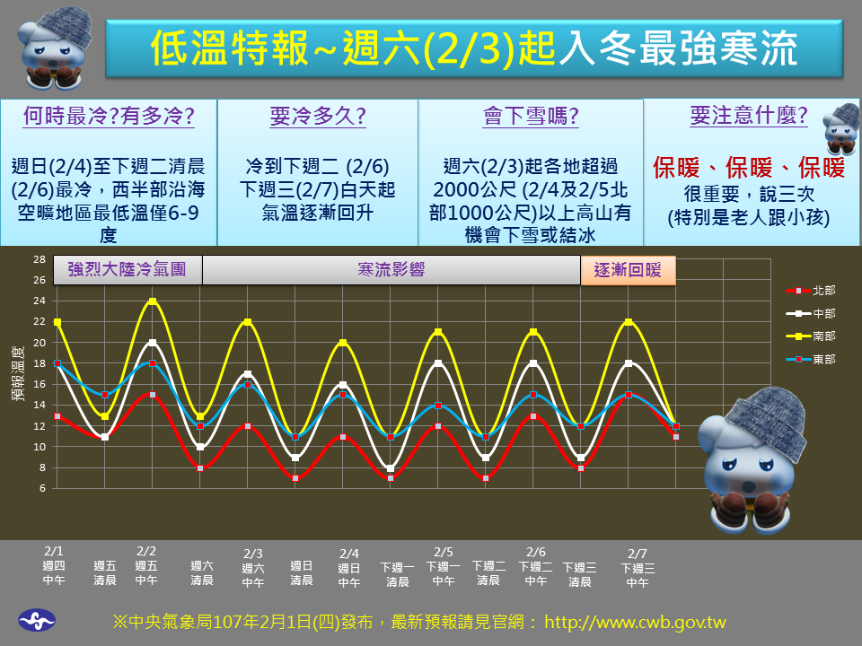 氣象局也提醒,農漁養殖業者要慎防寒害,而上山追雪的民眾要記得掛雪鍊,沿海則需注意強風,另外老人和小孩要特別注意保暖,以免感冒。