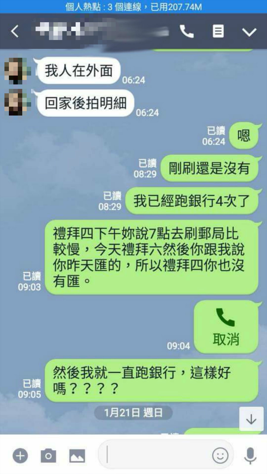 從對話截圖中可見,女乘客原先疑似聲稱自己已匯款,表示「我人在外面,回家後拍明細」,結果運將跑4次銀行刷本子,發現根本就沒有入帳紀錄,「禮拜四下午,妳說7點去刷郵局比較慢,今年禮拜六,然後妳跟我說妳昨天匯的,所以禮拜四妳也沒有匯,然後我就一直跑銀行,這樣好嗎?」