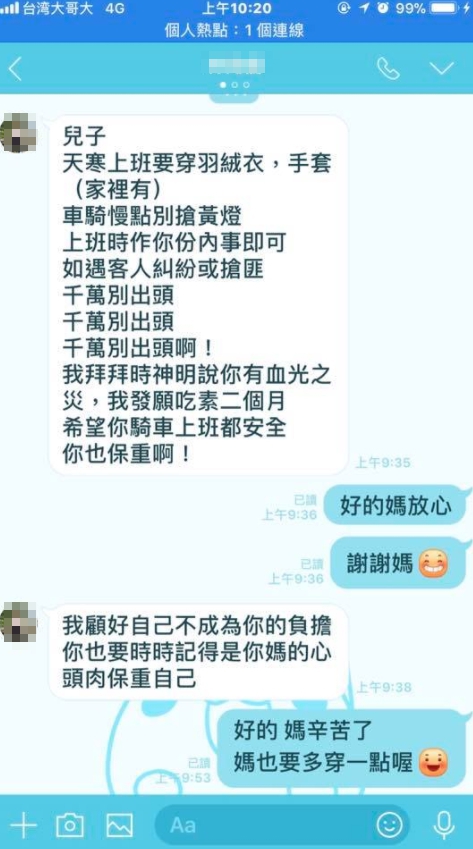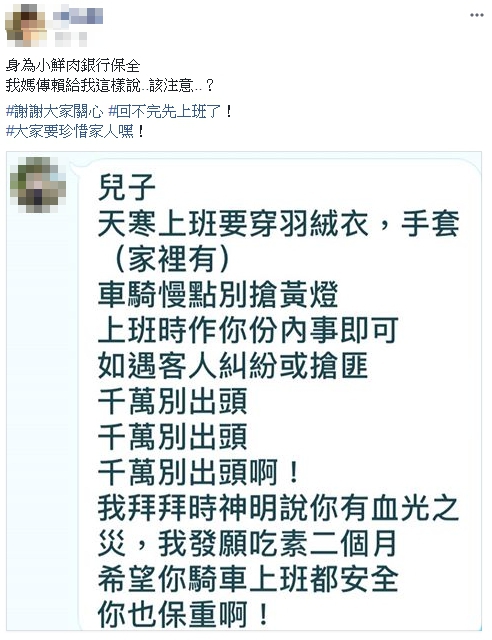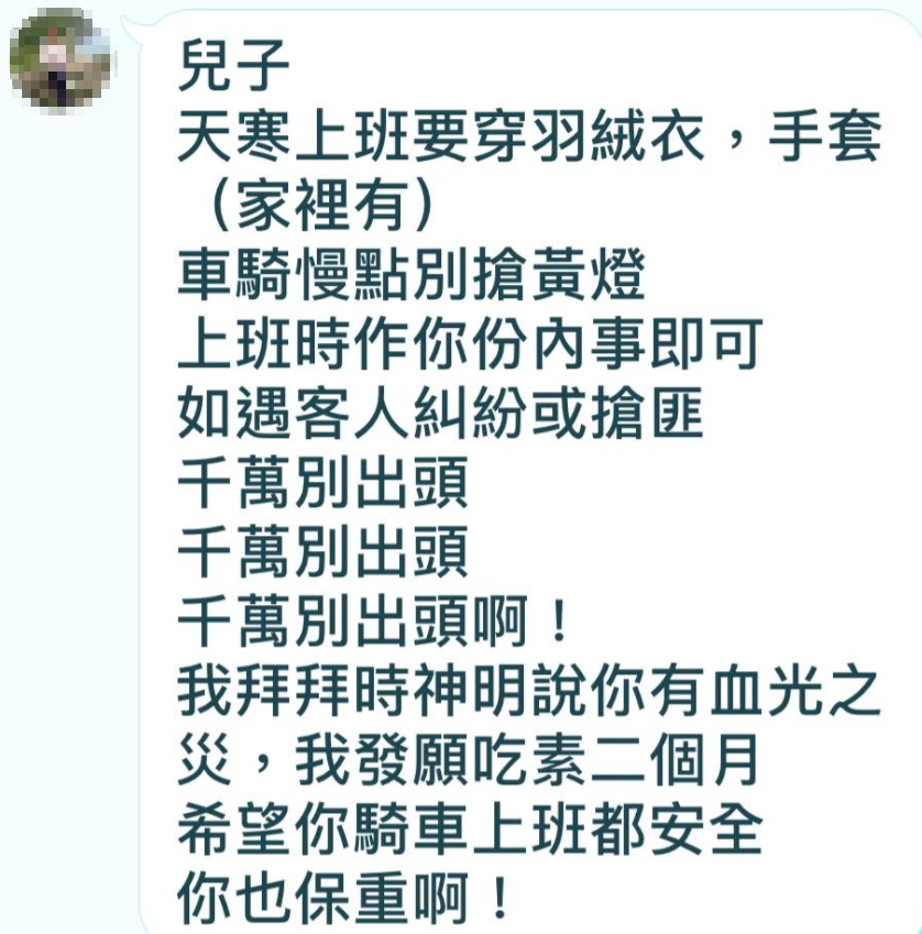 母親傳來的訊息,叮囑上班時做好自己份內的工作就好,若遇到糾紛或搶匪「千萬別出頭!」因為母親