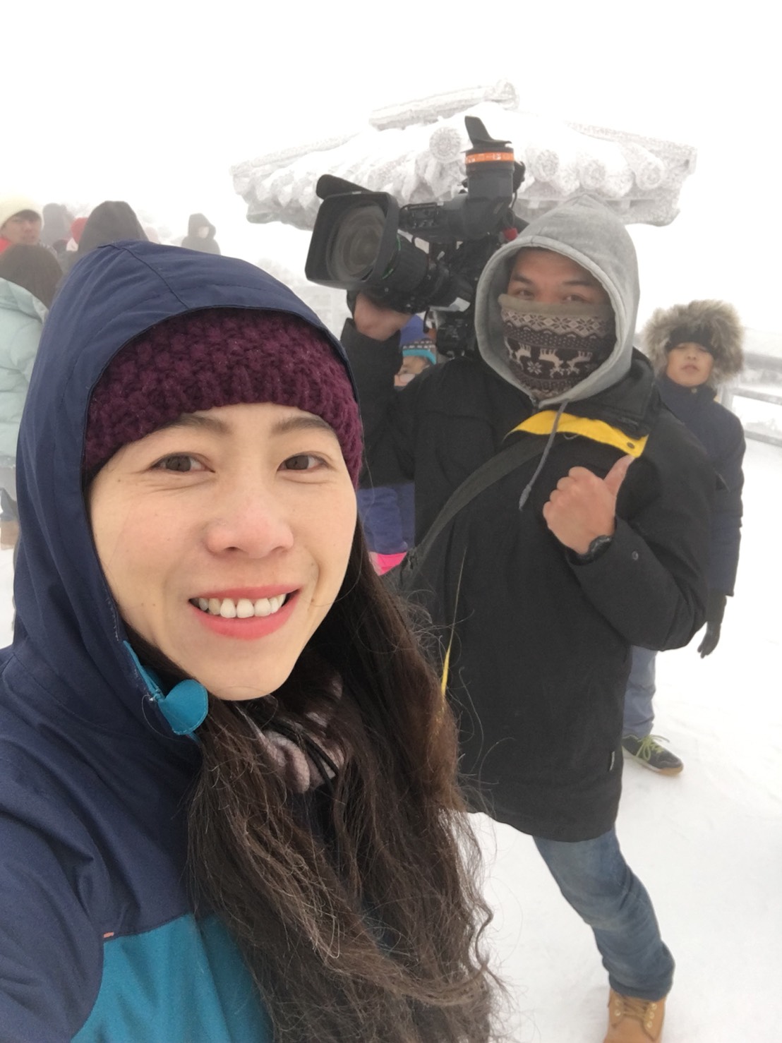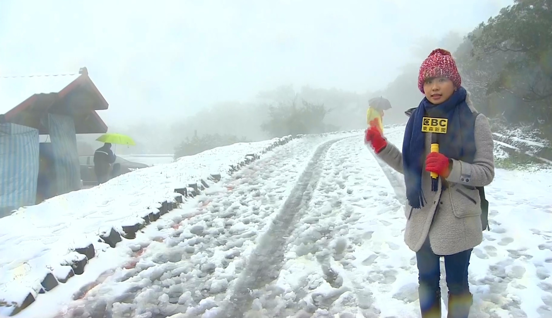 記者兼氣象主播李樺仙,星期六(2/3)晚上便前往大屯山頂拍攝冰霰,當時最低溫只有0.2度!晚上8點多先用手機拍攝影片回傳,為了操作手機,無法戴手套,只好“裸手”上工,0度低溫中硬撐10分鐘,雙手凍僵無感。今天(2/5)再次出發陽明山,最低溫達到-0.3度。早上7點多開始飄雪,為了省時搶快,在採訪車加裝雪鍊時,再次忍受寒風裸手用手機連線。此時二子坪停車場地上滿滿結冰積雪,攝影俞子堯扛機器揹著腳架、重量已經夠重,加上路面溼滑,踩在滿是雪跟冰的路面上,幾度差點滑倒。除了上述困難需要克服,這次播報最痛苦的則是因為雨夾雪不斷,長期踩在冰雪中、鞋子全溼,腳底板凍得發痛,是整天最折磨的事情。