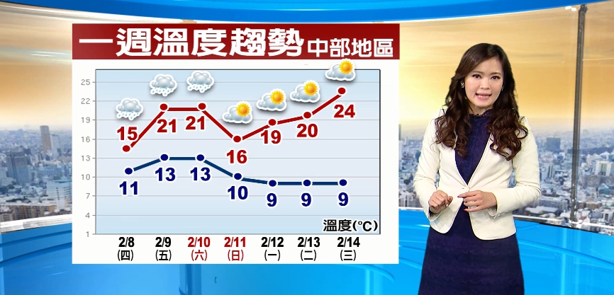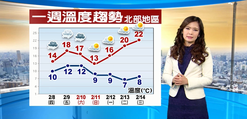 而週六晚上開始寒流南下,氣溫會快速下降,週日受到寒流及輻射冷卻影響,中部以北及東北部低溫將下探至8、9度,南部及花東則約11至13度,但下週一(12日)之後各地白天的高溫會逐日回升到20度以上。