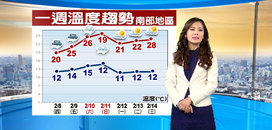 高溫會有明顯回升,但是星期六還有一波寒流南下,不過會是乾冷型態。而除夕至大年初二天氣穩定,只有東半部和北部有局部短暫雨。