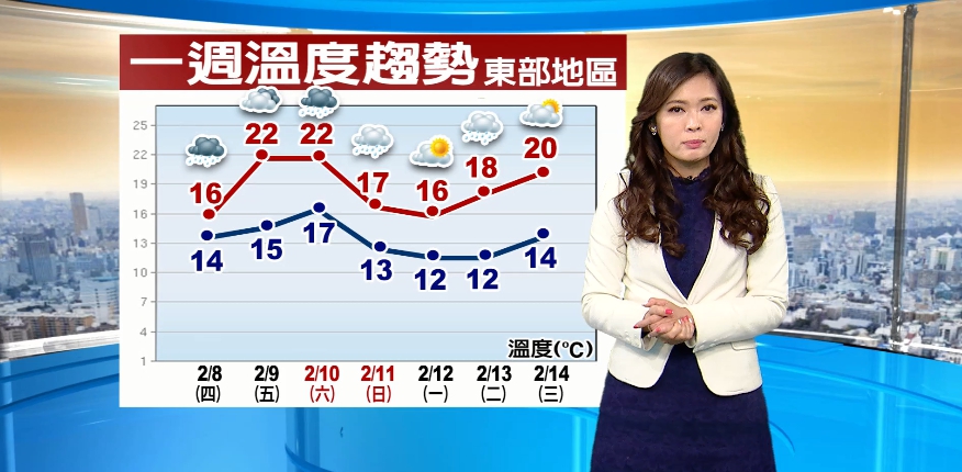 而明天雖然清晨低溫仍偏低,但白天各地氣溫回升,明顯有回暖的感覺,高溫普遍在18到22度,高屏局部地區甚至可以來到25度左右,不過受到鋒面接近影響,北部、東半部地區及中南部山區仍有局部短暫雨。
