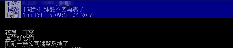 PTT上PO文表示,花蓮餘震不斷,晃動感相當明顯,而公司靠窗的牆面上竟出現裂縫,且裂縫還不只一處,讓他感到相當惶恐,卻仍必須將工作上的資料處理完畢。沒想到震完一波停止後,竟又接著下一波餘震,讓他嚇壞,問網友「我該跑嗎」,不知自己是否要拋下工作,趕緊逃生。