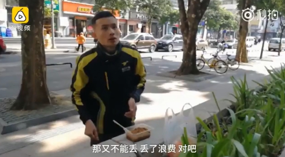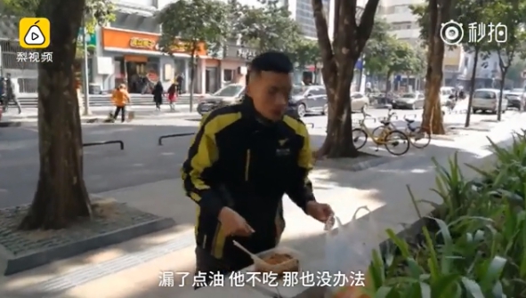 綜合陸媒報導,這名男子起初被認為因為沒時間吃飯,才得窩在路邊狼吞虎嚥地吃東西果腹。但外送員卻表示,因為餐點的包裝盒「太軟了」,外送時不慎灑出一點湯汁,疑似因為賣相不佳被僱客退貨,讓外送員必須要花人民幣20多元(約台幣93元)自行吸收,雖然不是昂貴的開銷,可是「丟了怕