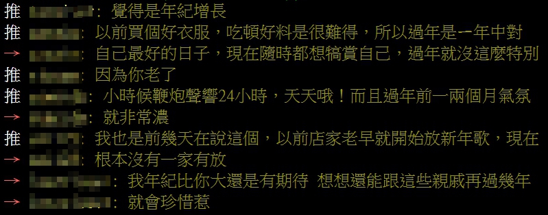貼文一出立刻引起網友共鳴「我也覺得年味很淡,可是說不出具體原因」、「我覺得是景氣差,以前大家有閒錢買一堆吃的還有很多新東西,也可能以過年為由到處聚會吃很多大餐跟到處旅遊」、「智慧手機的關係吧,吃完飯大家都在滑手機」。