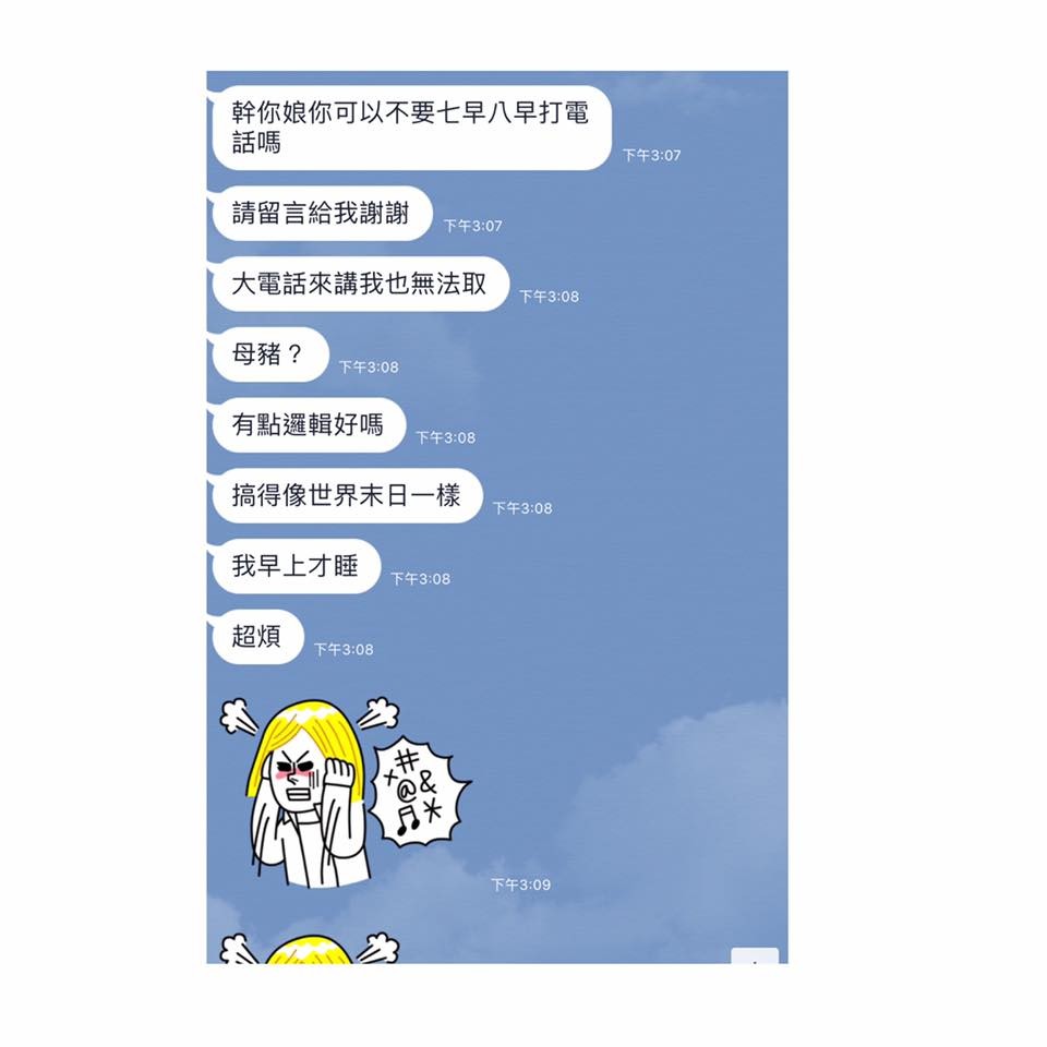從截圖中可見,友人劈頭就罵,「X你娘你可以不要七早八早打電話嗎?請留言謝謝,打電話來講我也無法取,母豬?有點邏輯好嗎?搞得像世界末日一樣,我早上才睡,超煩」,最後再連續發出氣到摀耳朵的貼圖。