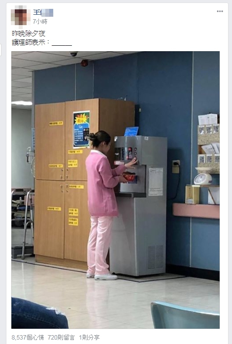 除夕夜的這個背影讓人特別覺得動容,一手拿著泡麵,一手按壓熱水,舉動看似普通,但護理師手中那碗平凡的泡麵,疑似就是她的「年夜飯」,因為這時候醫院裡的病人,可能比她的家人更需要她,讓護理人員們不得不放下家庭,過年依舊在醫院留守,有時甚至忙到沒時間好好吃一頓飯,只能用泡麵果腹。