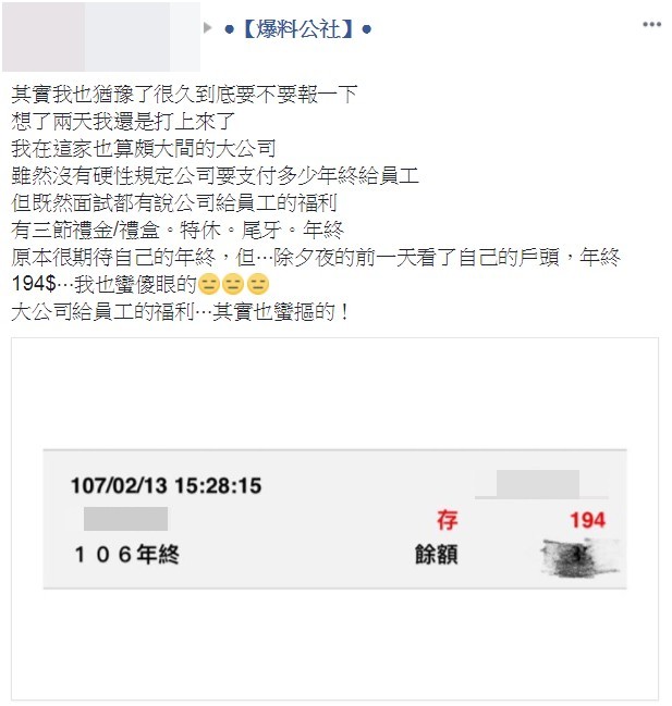 女網友表示自己在一間規模算蠻大間的公司上班,雖然才進公司半年,但因為面試的時候公司有說給員工的福利,包括三節禮金/禮盒、特休、尾牙和年終,讓她非常期待今年的年終獎金,沒想到小年夜的時候看到戶頭裡面年終獎金竟然只有194元,讓她非常傻眼,無奈表示「大公司給員工的福利…其實也蠻摳的」。