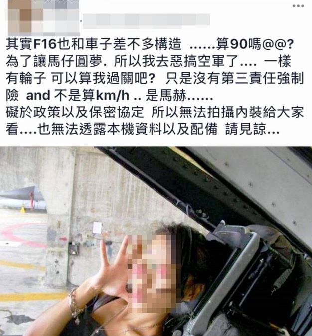 根據《自由時報》報導,昨(24日)晚在臉書某個社團中,網友PO出辣妹和友人在F-16前的開心合照,「為了馬仔圓夢,所以我去惡搞空軍了…」他炫耀F16的構造和車子其實差不多,一樣都有輪子只是沒有第三責任強制險,跑速則是以馬赫為單位,不忘嘲諷「礙於政策以及保密協定,所以無法拍攝內裝給大家看,也無法透露本機資料以及配備,請見諒。」
