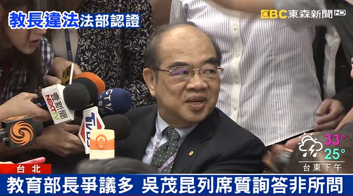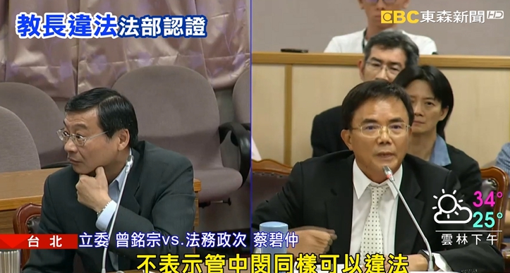 教育部長吳茂昆,滿臉無奈,列席立院質詢卻遭到藍委砲轟,因為前一天法務部政次蔡碧仲這段話。立委曾銘宗:「吳部長去接任基金會,也是先去也違法。」法務政次蔡碧仲:「我跟委員報告,我們現在就是說,吳部長違法,不表示管中閔同樣可以違法,這個社會裡面,很多人在做六合彩,不表示沒有抓到的,就沒有被辦。」