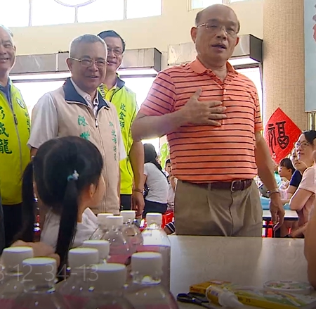 站在大太陽下,蘇貞昌出考題,拿手板當關主,陪小學生玩陸地版龍舟,週末假期,蘇貞昌父女倆同台現身。蘇貞昌一桌一桌玩,遇到熱情的小粉絲,使勁全力擊掌,還會假裝痛痛甩手,完全融入小人國,蘇貞昌回到新北鶯歌固樁,也增加市民的好感度,對手侯友宜則到藍營票倉新店,跟基本盤站一起。
