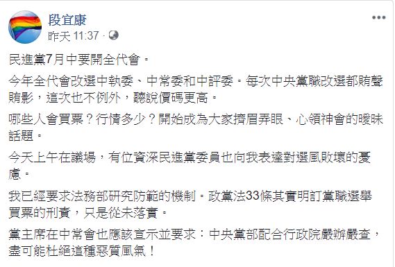 民進黨黨職選舉,月初才發生高雄黨代表,投票率高達96%而重選的爭議,而七月中旬又要舉行全代會,改選中央黨職,黨內要角立委段宜康就在臉書上寫道,「每次中央黨職改選都賄聲賄影,這次也不例外,聽說價碼更高,哪些人會買票?行情多少?」言論一出,開始成為大家擠眉弄眼,心領神會的曖昧話題。