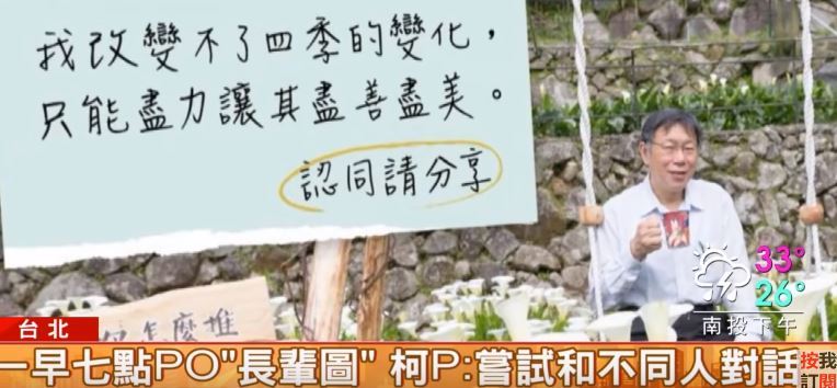 照片裡,柯P坐在一片海芋當中,搭配旁邊的題字,跟大家說早安,柯P「長輩圖」成功製造話題。台北市長柯文哲:「很多東西就是大家高興,大家喜歡就好,嘗試和不同人對話,務實和對話,就是我們執政的原則。」