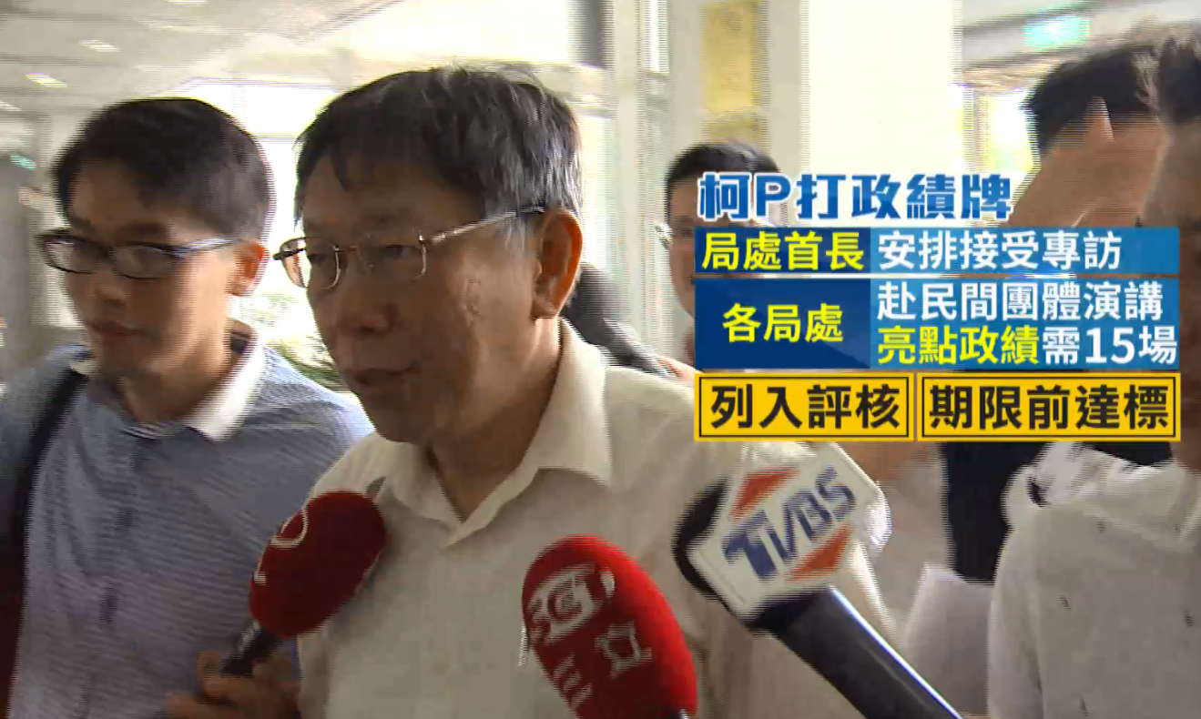 據了解,柯P下令要局處首長們多安排接受媒體專訪,各局處也必須跟民間團體多宣傳市府的「亮點政績」,不僅列入績效評核,還要在期限前達標。北市產業局長林崇傑:「事實上從去年開始,跟所有的公協會拜訪,到現在已經超過30幾場,這個應該不是為了選舉在做,因為本來市府在推動所有工作,就必須跟別人對話做為了解。」