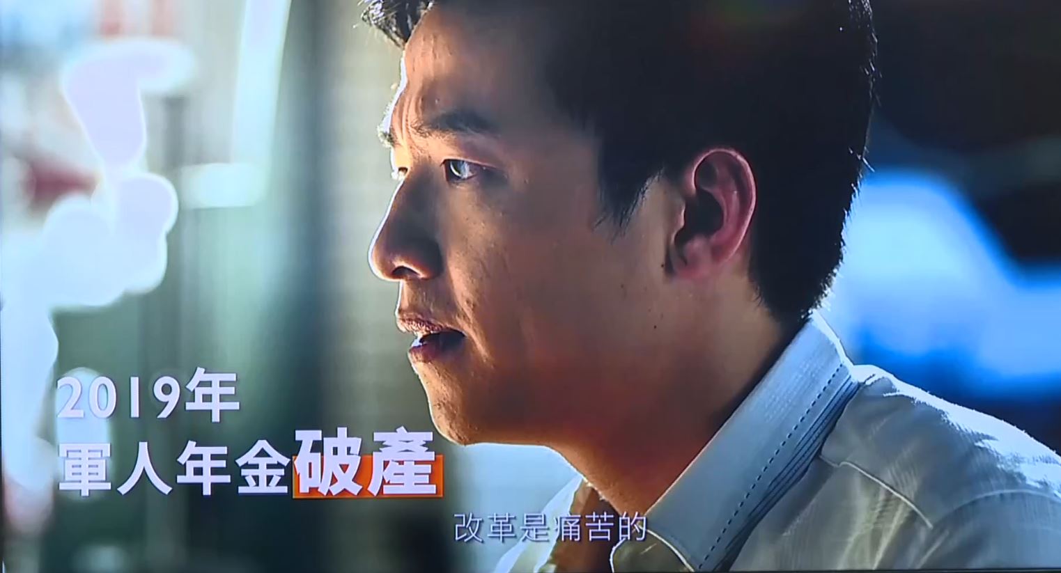 影片中聽到前總統陳水扁馬英九談論年金改革,最後是總統蔡英文堅定的發言,再顯示執政黨改革決心。