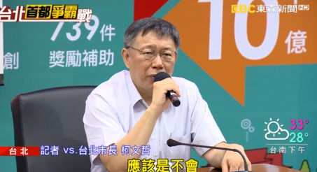 台北市長柯文哲:「應該是不會,我跟你說我們台灣的政治人物,每個都做好做滿,講到最後都沒做到,所以算了。我們原則上是,我們知道我們在做什麼事情,那也不要話講得太滿。」