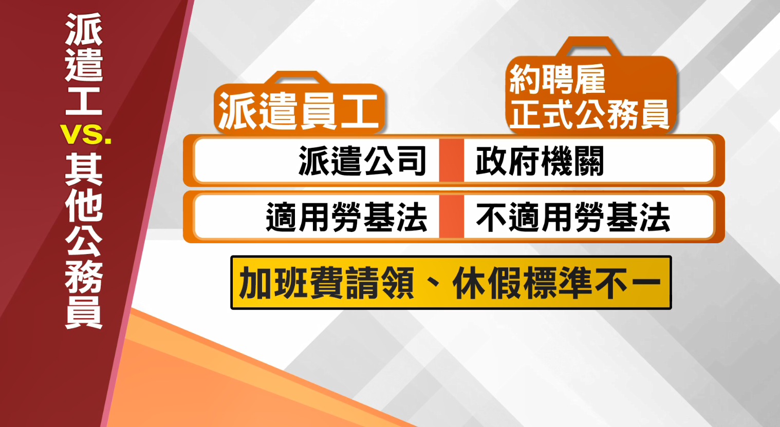 就擔心派遣人數表面上變少,但非典型聘雇依舊存在,除了派遣以外,自然人承攬臨時人員最慘,沒辦法受到勞基法保障,派遣員工和其他公務員差在哪,派遣員工的雇主是派遣公司,約聘雇則是政府單位員工,直屬政府機關,派遣工適用勞基法約聘雇,正式公務員卻不試用,加班費請領、休假標準都不一樣。