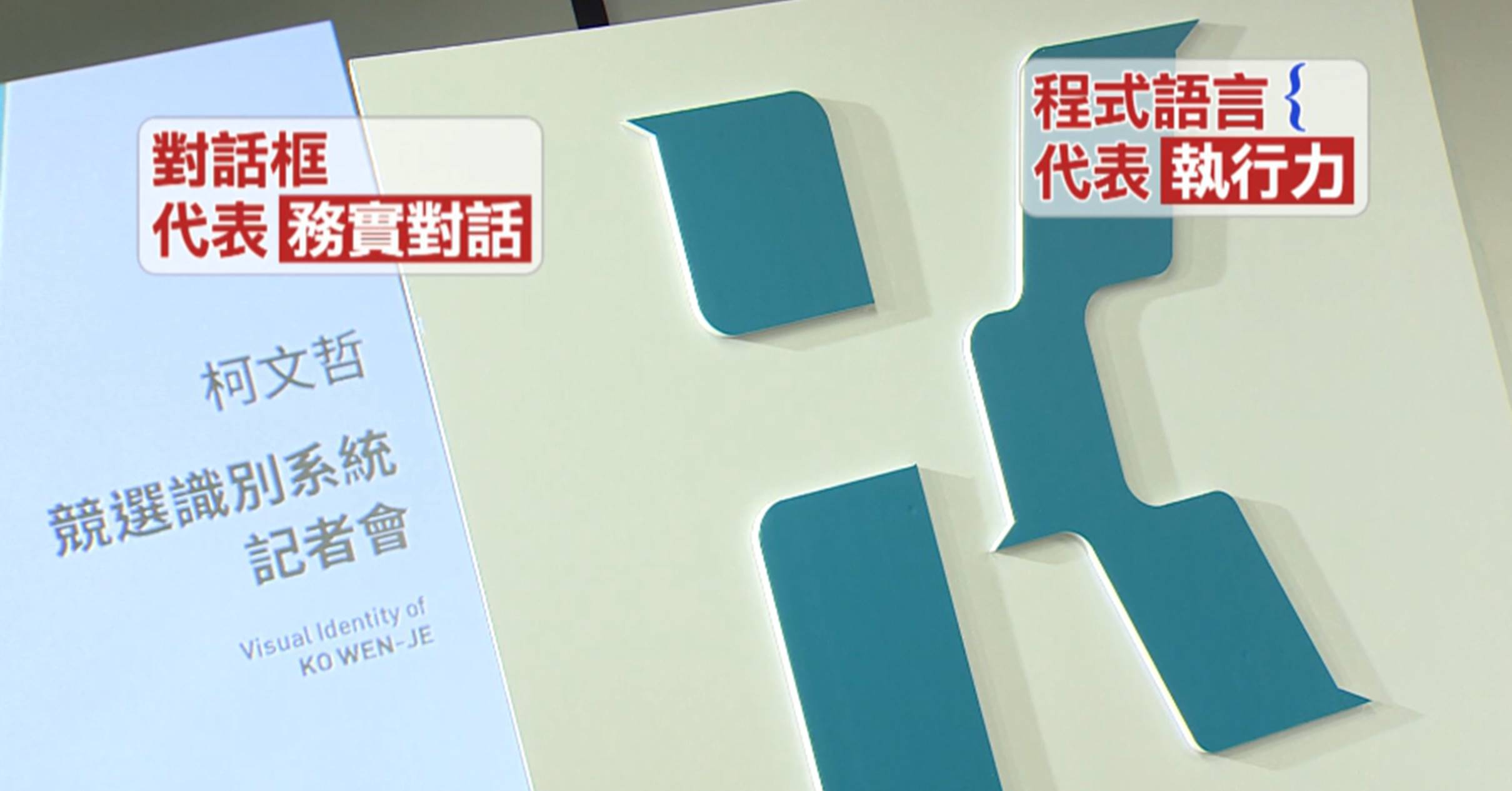 台北市長柯文哲:「白底當然是白色力量,另外一個是代表、也是提醒大家,柯文哲還是來自醫界,我們醫界是穿白袍。」大大一字 「K」蘊含多重理念,左半邊上下對話框,代表貫徹務實對話,而右半邊是程式語言中的左括弧,象徵執行力的實踐,組在一塊兒,還有這個特別意義。