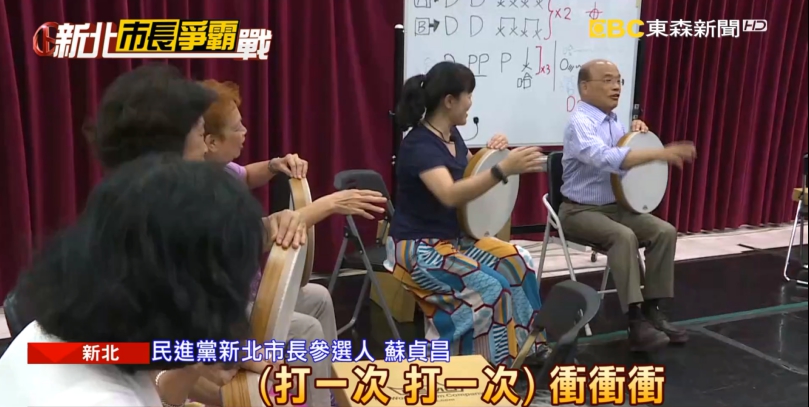 民進黨新北市長參選人蘇貞昌唱到:「(擊鼓)衝衝衝!(擊鼓)衝衝衝!(擊鼓)衝衝衝!」