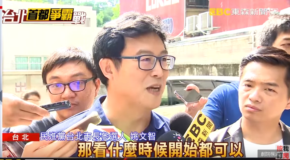 民進黨台北市長參選人姚文智:「非常歡迎啊,他說6個議題啊,我想再多也沒有關係,每周都來辯一次我覺得也不錯,那看什麼時候開始都可以。」