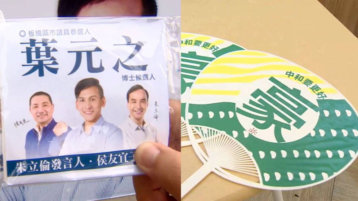 綠營參選人選戰策略主打個人特色,國民黨議員參選人則選擇黏TT戰術。參選人自己的相片跟名字能放多大就多大,幫忙力挺背書的人像也要夠清楚,黨徽就當加分用。國民黨新北板橋議員參選人葉元之:「所有的議員參選人都跟侯友宜建立『厚友誼』,文宣品都會把LOGO放上去,走在路上都會有很多鄉親主動來聊天支持我,說他是侯副的嘉義同鄉,或是侯副的學弟,侯副在民間的聲望跟人氣真的非常高,我覺得對我有幫助。」不止看板,就連文宣小物,議員參選人葉元之也都跟侯友宜黏緊緊,連車廂打開,也都是侯友宜的旗子。國民黨新北板橋議員參選人葉元之:「拿到我的面紙,看到侯友宜就會說『你是侯友宜推薦!一定支持』,很多人看到面紙也會說,我知道你,你跟侯友宜一起出來,對人家印象很深。」
