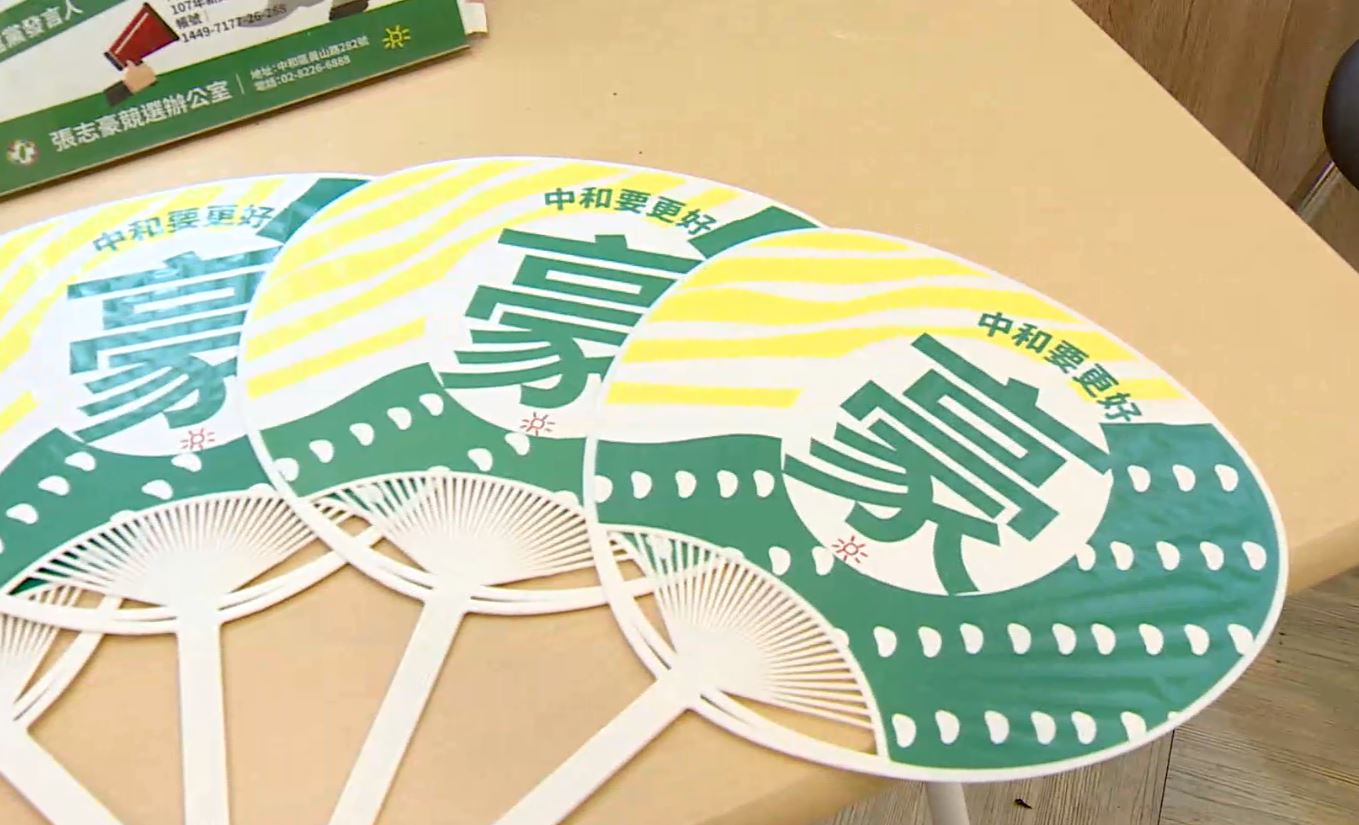 炎炎夏日,議員參選人張志豪在中和街頭發送比臉還要大的扇子,果然受歡迎,但其中顏色更是關鍵,並非傳統死綠,還搭上淺黃色,看起來溫和許多,也少了點政治味。民進黨新北中和議員參選人張志豪:「這個比較清新可愛風,比較日式的扇子風格,這樣大家比較愛不釋手,所謂個人風格就是用名字的最後一個字,張志豪的『豪』,『衝衝衝』他就是一個衝字,他一個衝字代表他的一切。」綠營企圖用文宣品打出個人特色,像張志豪的黑色背心上頭除了名字,最顯眼的就是那顆小太陽。民進黨新北中和議員參選人張志豪:「民眾說『你是小太陽!』我就說對呀我是小太陽,大家就會知道,小太陽(團隊)一脈相承,從趙永清,到江永昌,到張志豪。」