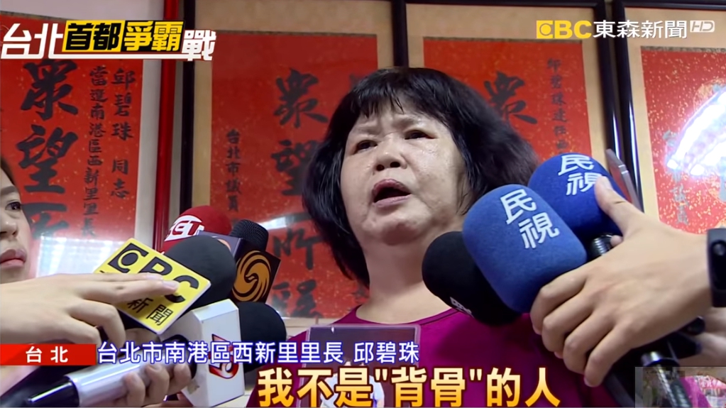 台北市南港區西新里里長邱碧珠:「我不是『背骨』的人,一個姚文智候選人,大牌的市長候選人,你竟然都不把我看在眼裡,我真的我心真的也是很痛,我的眼淚難道會白流嗎?」