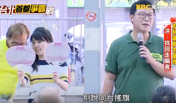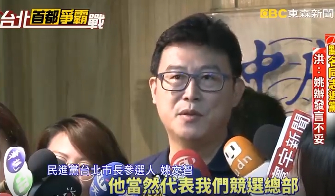 民進黨台北市長參選人姚文智:「我們的洪發言人她是年輕優秀,她當然代表我們競選總部,毫無疑問!」