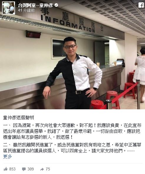台北市議員童仲彥喝酒開車,酒駕肇事後,今天他在鏡頭前道歉,並表示他會退出年底的市議員選戰。