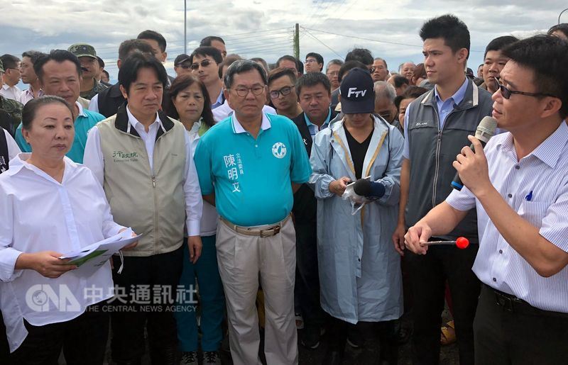 受熱帶性低氣壓影響,嘉義地區昨天降下超大豪雨,多處淹水,賴清德上午與行政院團隊在嘉義縣長張花冠、嘉義縣第2選舉區選出的民主進步黨籍立法委員陳明文等陪同下視察嘉義縣埤子頭排水滯洪池預定地。