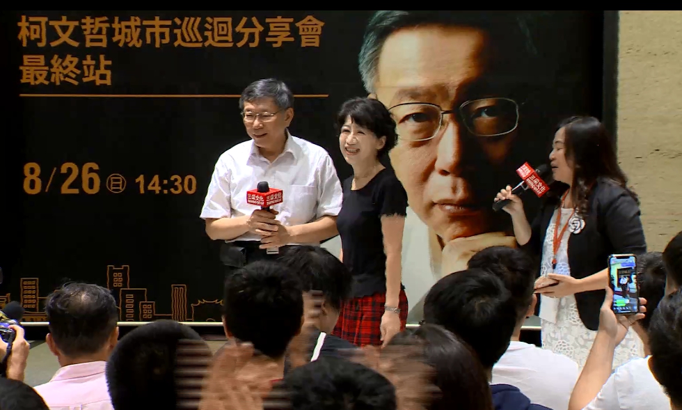 夫人陳佩琪:「(問題是等一下人家問妳為什麼特別參加這一場,我還要先想一個理由說明一下)這私人的場合啊,以後公家的我不出去了。」你一句、我一句,柯文哲夫婦出現在台北街頭開直播,這是夫人在臉書發飆後,兩夫妻難得公開現身,邊走邊抬槓,原來是正要前往簽書會最終場。柯文哲進場,滿場粉絲為之瘋狂,各個高舉手機讓這位政壇紅人享受巨星待遇,在粉絲前,柯文哲不只談政治理念,也對中南部治水給意見。