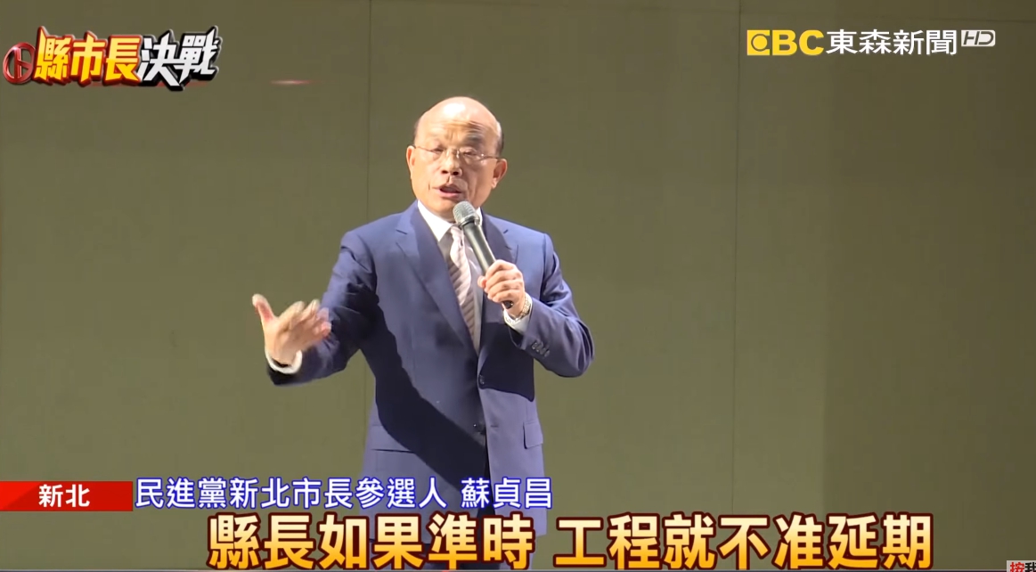 民進黨新北市長參選人蘇貞昌:「我準時來,他們說要晚一點,因為前面有拖延,我只好在外面等,因為我作縣長的時候,是準時有名,縣長如果準時工程就不准延期,以後我當市長,這種案都不能延期。」